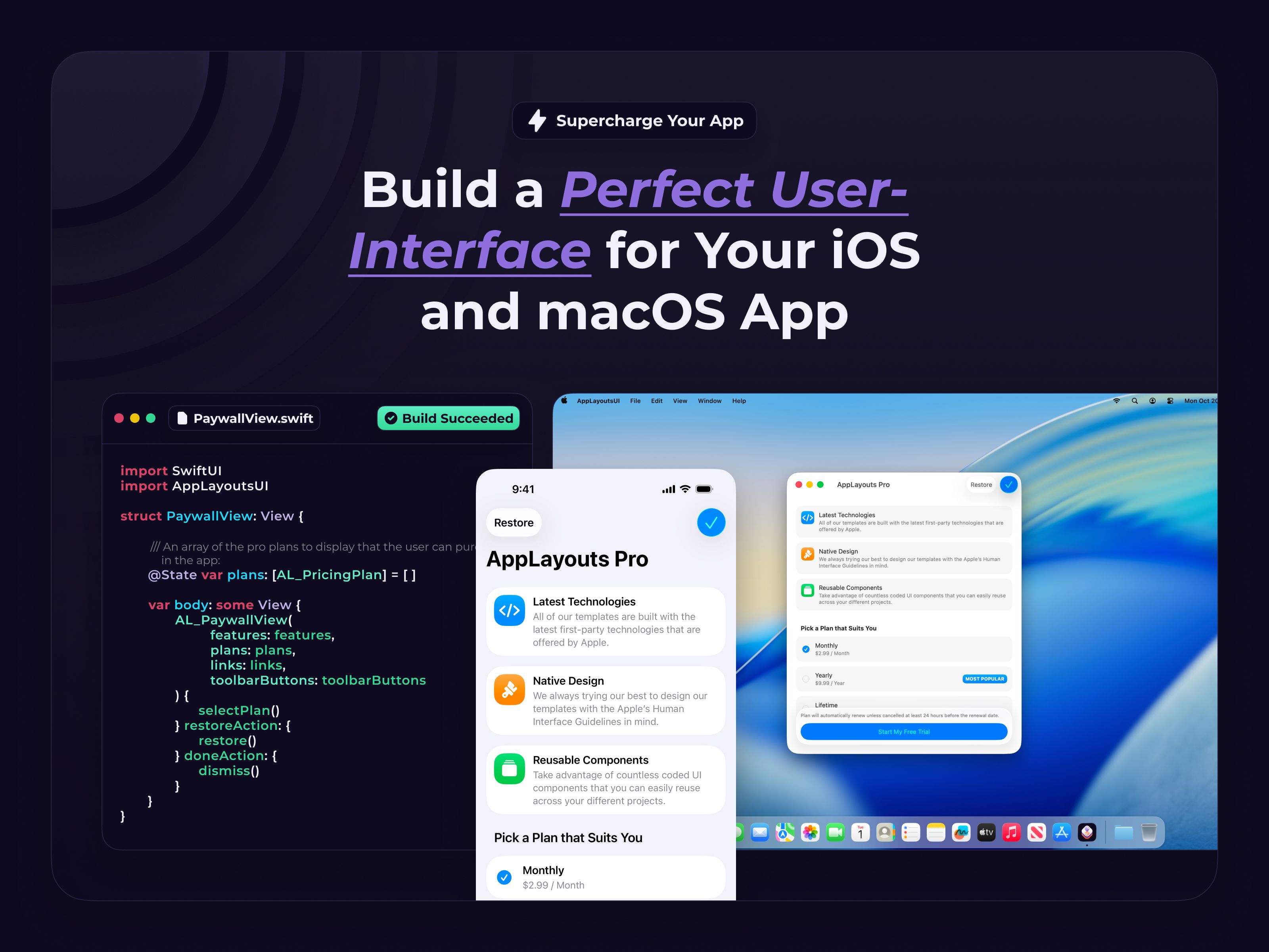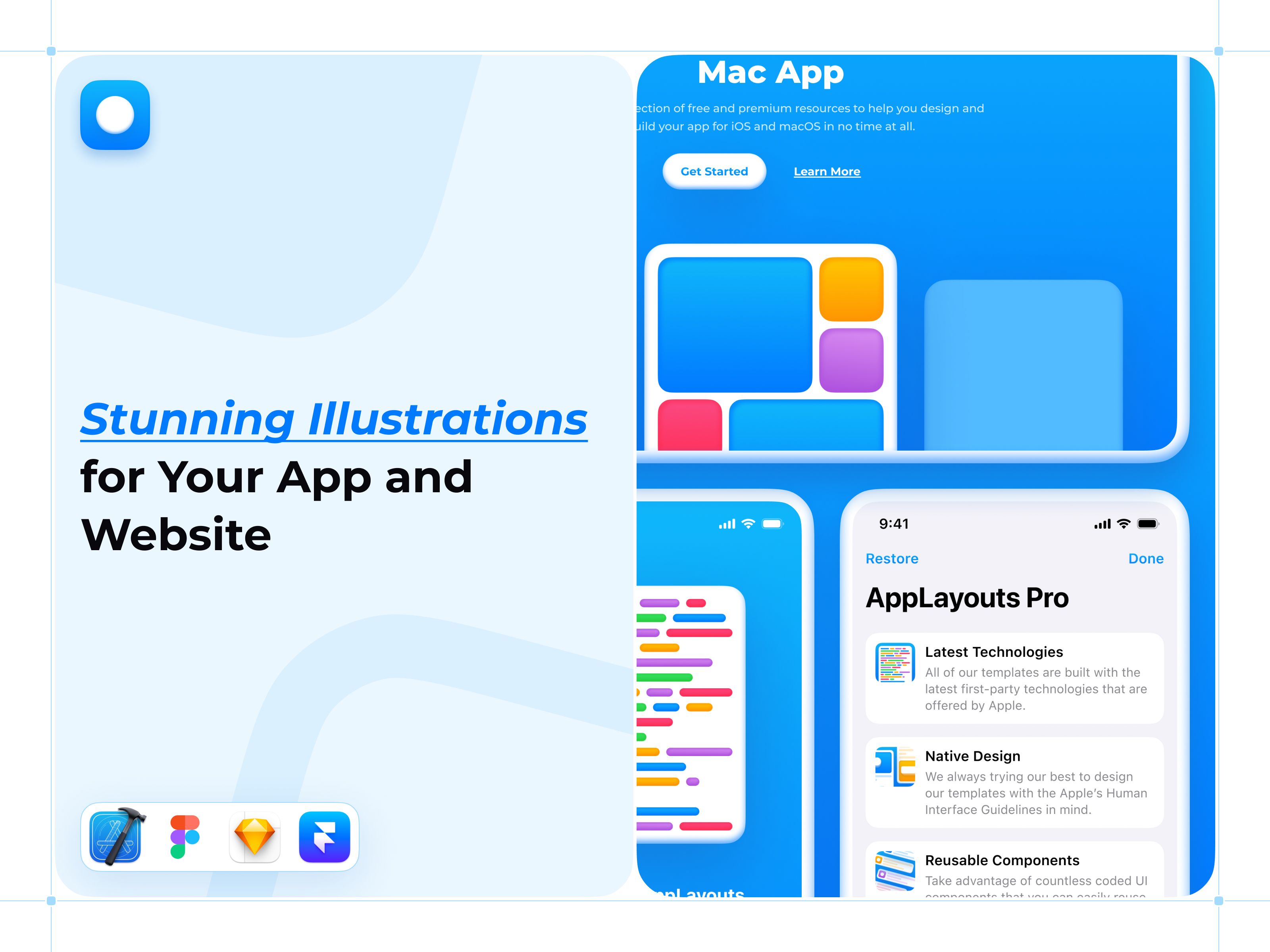 Welcome to AppLayoutsUI AppLayoutsUI is an extensive SwiftUI components library designed to help you build a perfect user-interface for your iOS and macOS app in no time at all. It offers countless of reusable SwiftUI components, sections, and screens that you can customize to suit the needs of your unique app project. All of the components, sections, and screens were designed with Apple's Human Interface Guidelines in mind to help you make your app feel right at home on any iOS and macOS device. We have built this components library using SwiftUI, the latest and greatest first-party technology from Apple. With AppLayoutsUI, you can supercharge your iOS and macOS app with a large array of highly-customizable hand-crafted SwiftUI components that can be effortlessly reused. What You Will Get AppLayoutsUI comes in a form of a Swift package that includes: 60+ components25+ sections10 screens Questions and Support You can find the answers to some of the frequently asked questions here, but if you ever have any questions, you can always get in touch with us via email at [email protected] or by sending us a message on X/ Twitter. We are always happy to help! Apple, iPhone, Mac, iOS, macOS, Xcode, and SwiftUI are trademarks of Apple Inc. We don’t have any affiliation with Apple Inc. iOS 17 or later, macOS 14 or later, and Xcode 26 or later are required. By purchasing AppLayoutsUI, you acknowledge that you have read and agree to our terms of use.