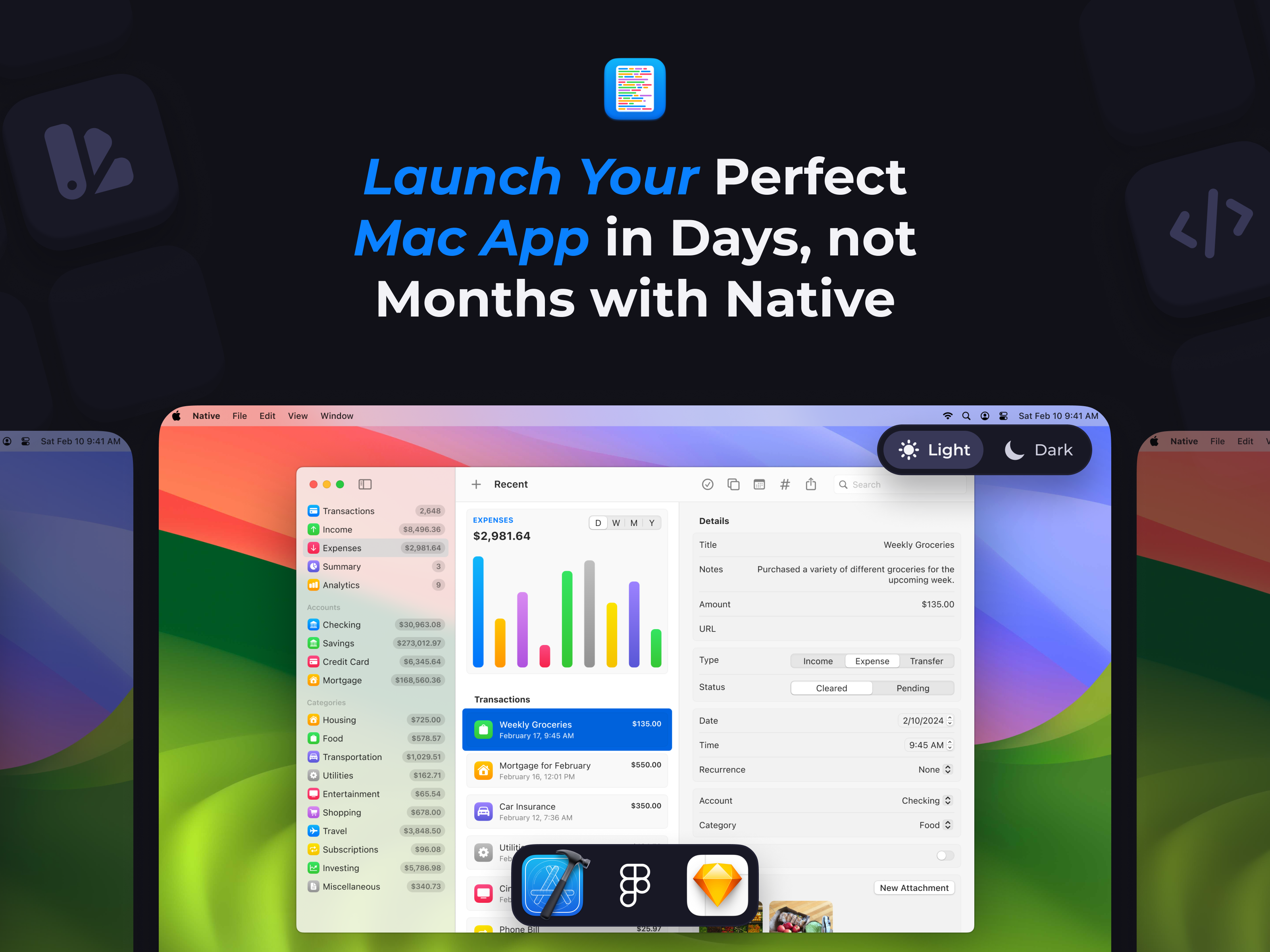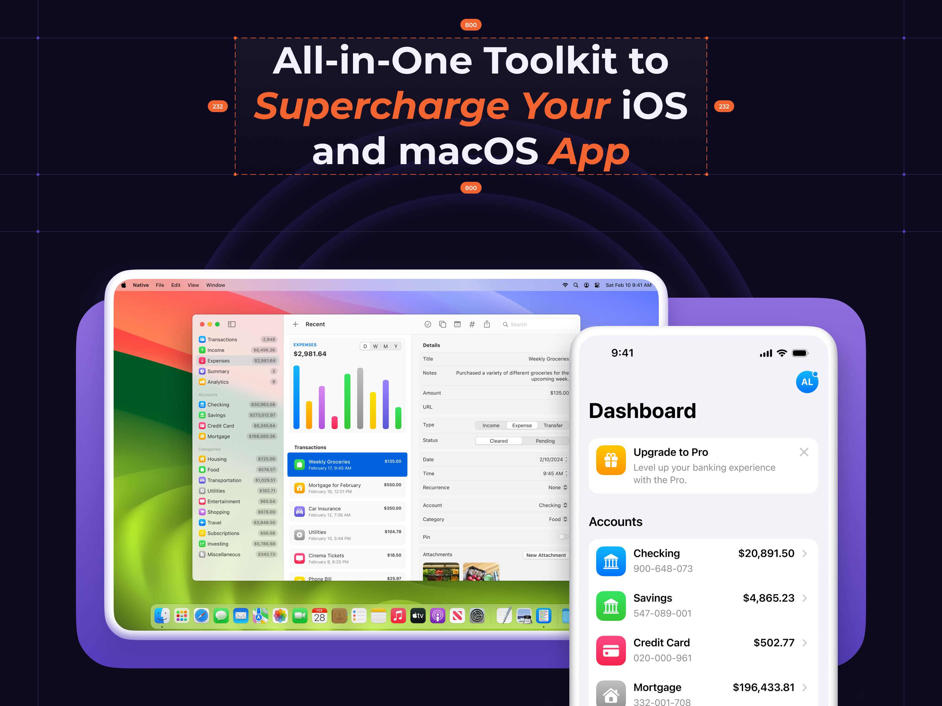 Welcome to Native Native is the multipurpose app template for macOS that was designed to help you launch your Mac app in no time at all. It offers coded screens with the design files for both Figma and Sketch included across 5 different categories, such as onboarding, paywall, sidebar with content, file editing, and settings. All of the screens were designed with Apple's Human Interface Guidelines in mind to help you make your app feel right at home on any macOS device. We have built this template using SwiftUI, the latest and greatest first-party technology from Apple. With Native, you can supercharge your macOS app project with an extensive array of highly-customizable hand-crafted SwiftUI components that can be effortlessly reused - it's as simple as drag and drop. What You Will Get Xcode project with 35 unique screens and different reusable components built with SwiftUIFigma and Sketch design files with all of the screens in both light and dark modes, as well as UI components library and styleguide Questions and Support You can find the answers to some of the frequently asked questions here, but if you ever have any questions, you can always get in touch with us via email at [email protected] or by sending us a message on X/ Twitter. We are always happy to help! Apple, Mac, macOS, Xcode, and SwiftUI are trademarks of Apple Inc. We don’t have any affiliation with Apple Inc. This template is meant to be used only for the apps that run on the Apple's platforms. macOS 14 and Xcode 15 are required. Coding experience is required to modify this template. Please also note that some of the elements that are used in the design of this template weren't originally designed by us. This includes San Francisco font: developer.apple.com/fonts and SF Symbols icons: developer.apple.com/sf-symbols from Apple, as well as various system components in macOS that were originally designed by Apple that we have only recreated for this template. By purchasing this template, you acknowledge that you have read and agree to our terms of use.