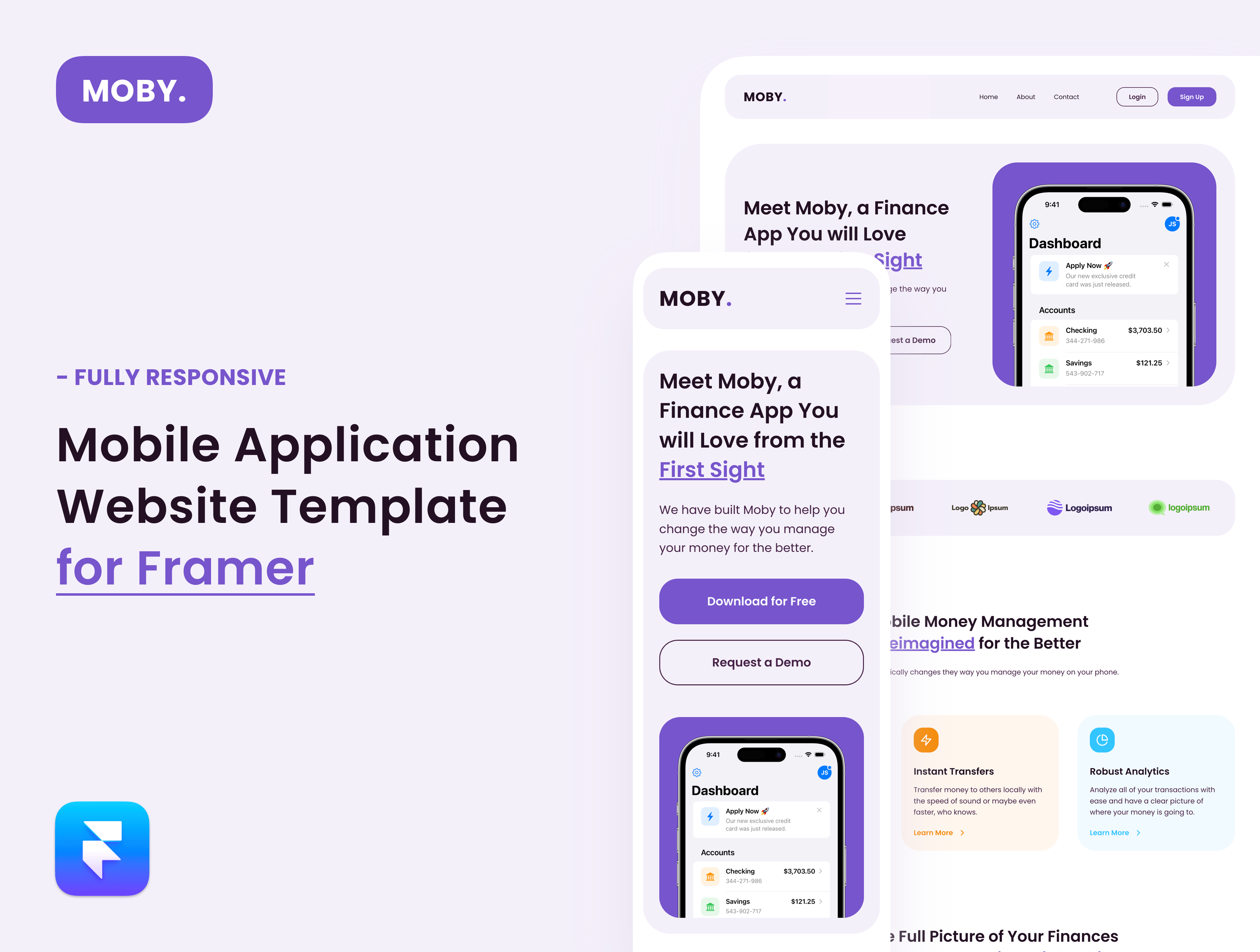 Welcome to Moby Moby is a beautiful mobile application website template that is built to help you market your mobile application better and showcase all of its key features and advantages to the potential users. It was designed and built in Framer and it requires no coding experience to modify any of its content. It comes with global color and text styles, as well as a large library of reusable components that you can take advantage of to build upon this template and add more pages or custom layouts. What You Will Get Home pageAbout pageContact pagePrivacy policy pageTerms of service page404 pageBreakpoints for desktop, tablet and mobileGlobal color and text stylesLibrary of dozen of reusable components Questions and Support If you ever have any questions, you can always get in touch with us via email at [email protected] or by sending us a message on X/ Twitter. We are always more than happy to help! iPhone and iPad mockups used in this template can be found here: developer.apple.com/design/resources/#product-bezels. iPhone and iPad are trademarks of Apple Inc. We don't have any affiliation with Apple Inc. Free icons used: feathericons.com. Free Google font used: fonts.google.com/specimen/Poppins?query=poppins. Placeholder logos used: logoipsum.com. By purchasing this template, you acknowledge that you have read and agree to our terms of use.