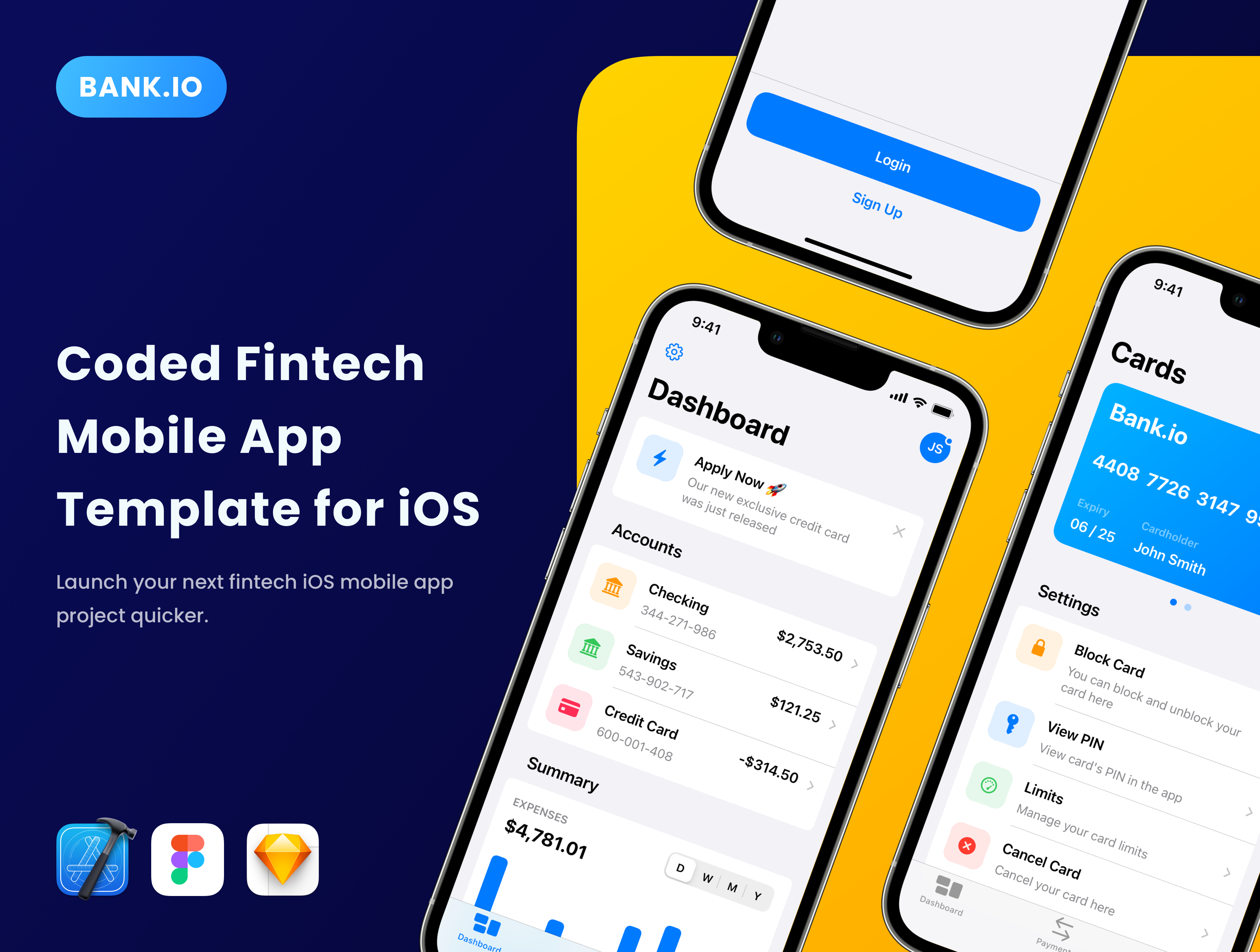 Welcome to Bank.io Bank.io is the coded fintech mobile app template for iOS that was built to help you supercharge your iOS mobile app project and speed up its development. It was designed with Apple's Human Interface Guidelines in mind to help you make your app feel right at home on any iOS device, as well as improve the overall user experience. We have also taken care of dark mode and dynamic type support. With Bank.io, you can supercharge your iOS app project with an extensive array of highly-customizable hand-crafted SwiftUI components that can be effortlessly reused - it's as simple as drag and drop. What You Will Get Xcode project with 10+ unique screens and different reusable components built with SwiftUIFigma and Sketch design files with all of the screens, as well as UI components library and styleguide Questions and Support If you ever have any questions, you can always get in touch with us via email at [email protected] or by sending us a message on X/ Twitter. We are always more than happy to help! Apple, iPhone, iOS, Xcode, and SwiftUI are trademarks of Apple Inc. We don’t have any affiliation with Apple Inc. This template is meant to be used only for the apps that run on the Apple's platforms. iOS 16 or later and Xcode 15 are required. Coding experience is required to modify this template. Please also note that some of the elements that are used in the design of this template weren't originally designed by us. This includes San Francisco font: developer.apple.com/fonts and SF Symbols icons: developer.apple.com/sf-symbols from Apple, as well as various system components in iOS that were originally designed by Apple that we have only recreated for this template. By purchasing this template, you acknowledge that you have read and agree to our terms of use.